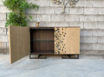 Credenza Astratta con struttura color noce e due ante colore rovere a contrasto con decorazione grafica geometrica.
