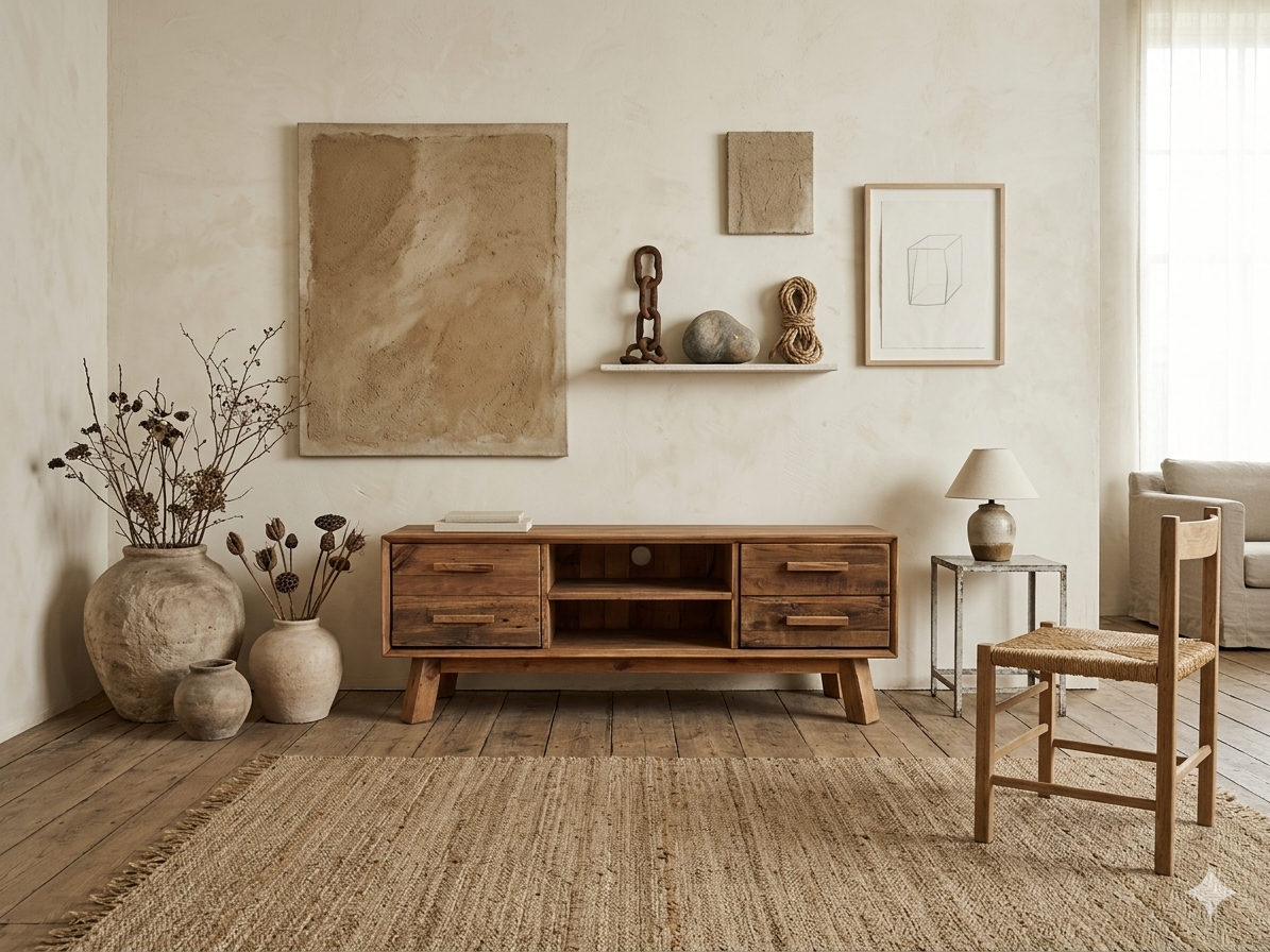 Questo mobile è il cuore pulsante di un ambiente in stile Wabi-Sabi o Rustic Modern.