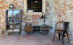 Sedia in ferro con sedile in pelle invecchiata
